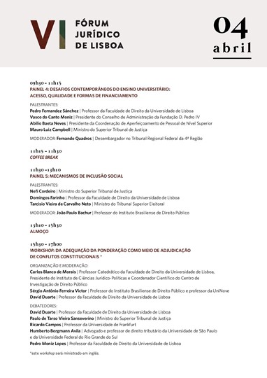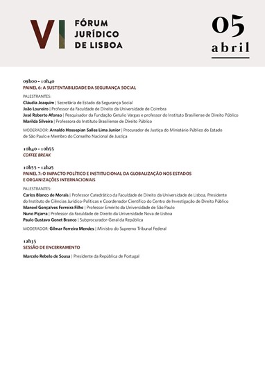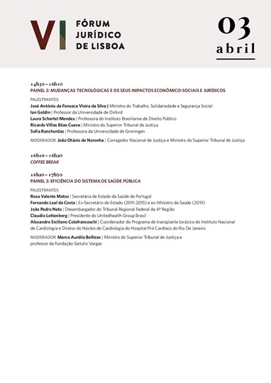 Haverá ainda outros assuntos de importância, como as “Mudanças tecnológicas e os seus impactos económico-sociais e jurídicos” ou “A eficiência do sistema de saúde pública”, que colocará ex-ministros da saúde e directores de serviços hospitalares de Portugal e do Brasil à conversa. Dia 4 de abril, será tempo de falar de “Inteligência artificial e solução de conflitos”, dos “Desafios contemporâneos do ensino universitário – acesso, qualidade e formas de financiamento”, de “Sustentabilidade da segurança social” e de “Impacto político e institucional da globalização nos estados e organizações internacionais”.