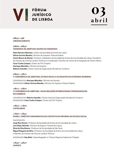 “O Estado Social e os Desafios da Economia Moderna” ou as “Novas Relações Internacionais e Reorganização do Comércio” serão alguns dos temas debatidos por personalidades como Henrique Meirelles, Ministro da Fazenda do Brasil, Roberto Azevedo, director-geral da Organização Mundial de Comércio, ou João Otávio de Noronha, ministro do Superior Tribunal de Justiça.
